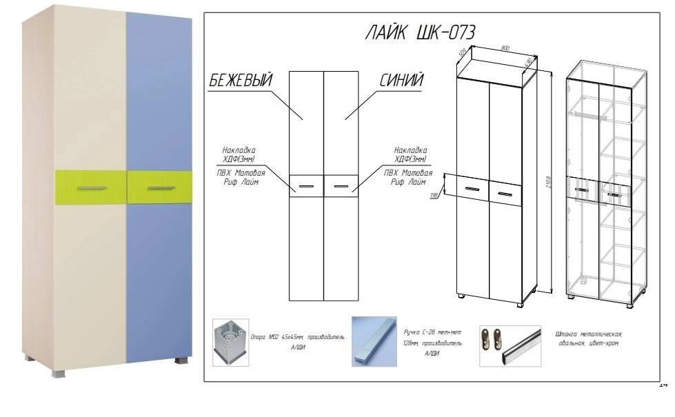 - Материал: ЛДСП 16мм/МДФ 10мм/Накладки на фасадах выполненные из ХДФ толщиной 3мм облицованного пленкой ПВХ Матовая Риф Лайм.