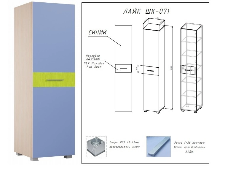 - Накладка на фасаде выполненная из ХДФ толщиной 3мм, облицованного Плёнкой ПВХ Матовая Риф Лайм, расположена по центру фасада, что позволяет ему открываться как на правую, так и на левую сторону.