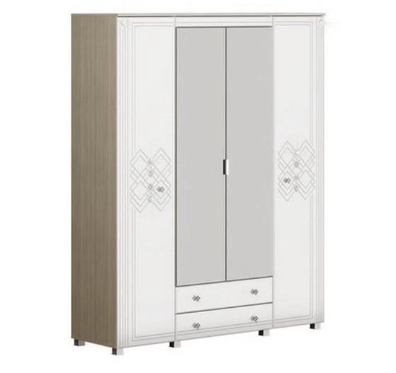 - Шкаф четырёхстворчатый состоит из секции с полками (шириной 1/4 шкафа),секцией со штангой и 2мя выдвижными ящиками (шириной 1/2 шкафа) и секцией с 2мя полками и штангой (шириной 1/4 шкафа)