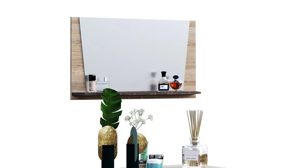 - Монтаж к стене осуществляется при помощи врезных навесов в количестве 2х штук согласно схемы сборки. Зеркало трапециевидной формы размером 800 х 450 мм. обработка по краям – ЕВРОКРОМКА. Допустимая нагрузка на полку при условии статичной равномерно распределенной нагрузки до 1,5 кг.