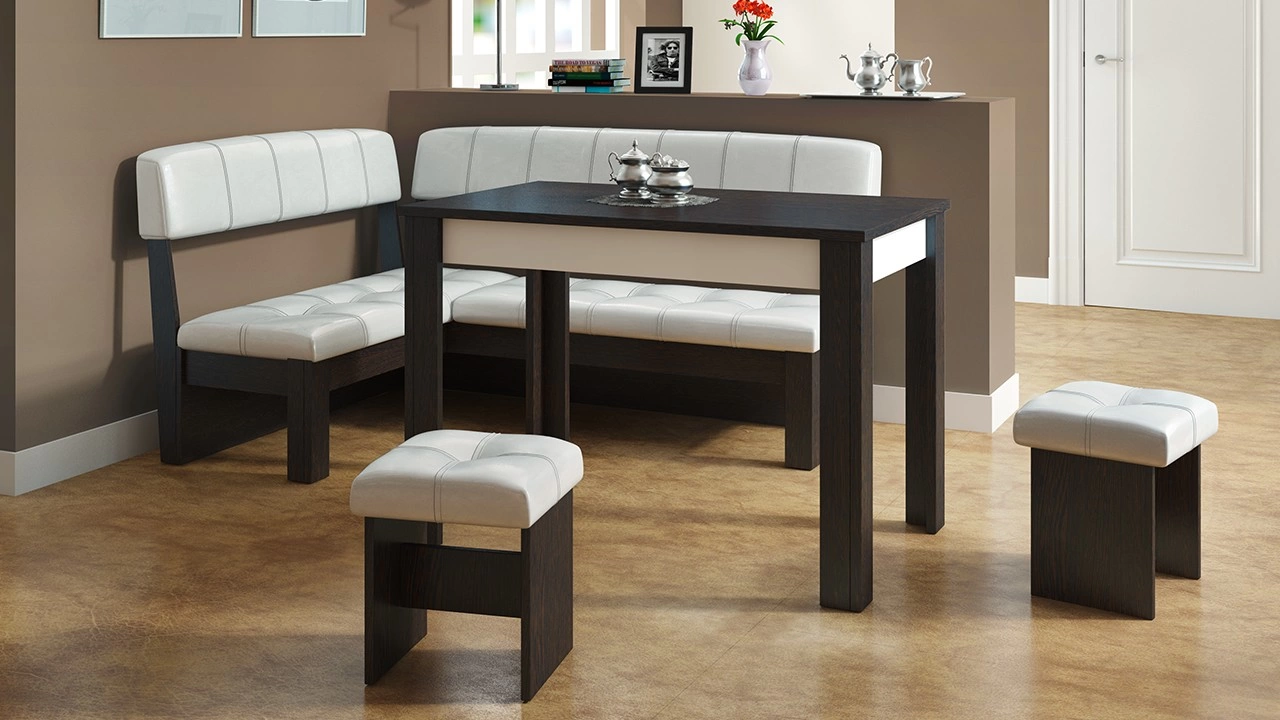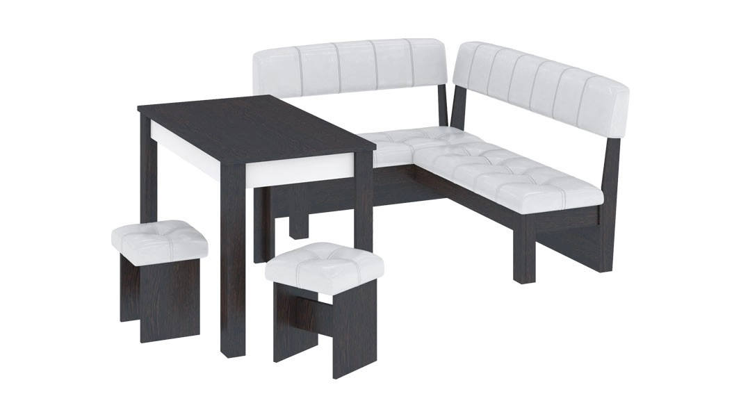 - Обеденная зона "Альфа" состоит из удобной угловой скамьи, практичного стола и компактных табуретов.